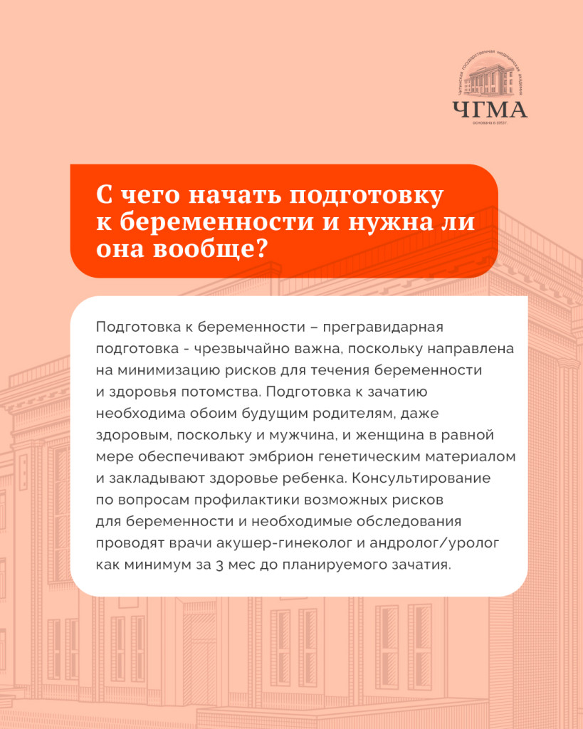 - Подготовка к беременности – прегравидарная подготовка - чрезвычайно важна, поскольку направлена на минимизацию рисков для течения беременности и здоровья потомства. Подготовка к зачатию  необходима обоим будущим родителям, даже здоровым, поскольку и мужчина, и женщина в равной мере обеспечивают эмбрион генетическим материалом и закладывают здоровье ребёнка. Консультирование по вопросам профилактики возможных рисков для беременности и необходимые обследования проводят врачи акушер-гинеколог и андролог/уролог как минимум за 3 мес до планируемого зачатия.
