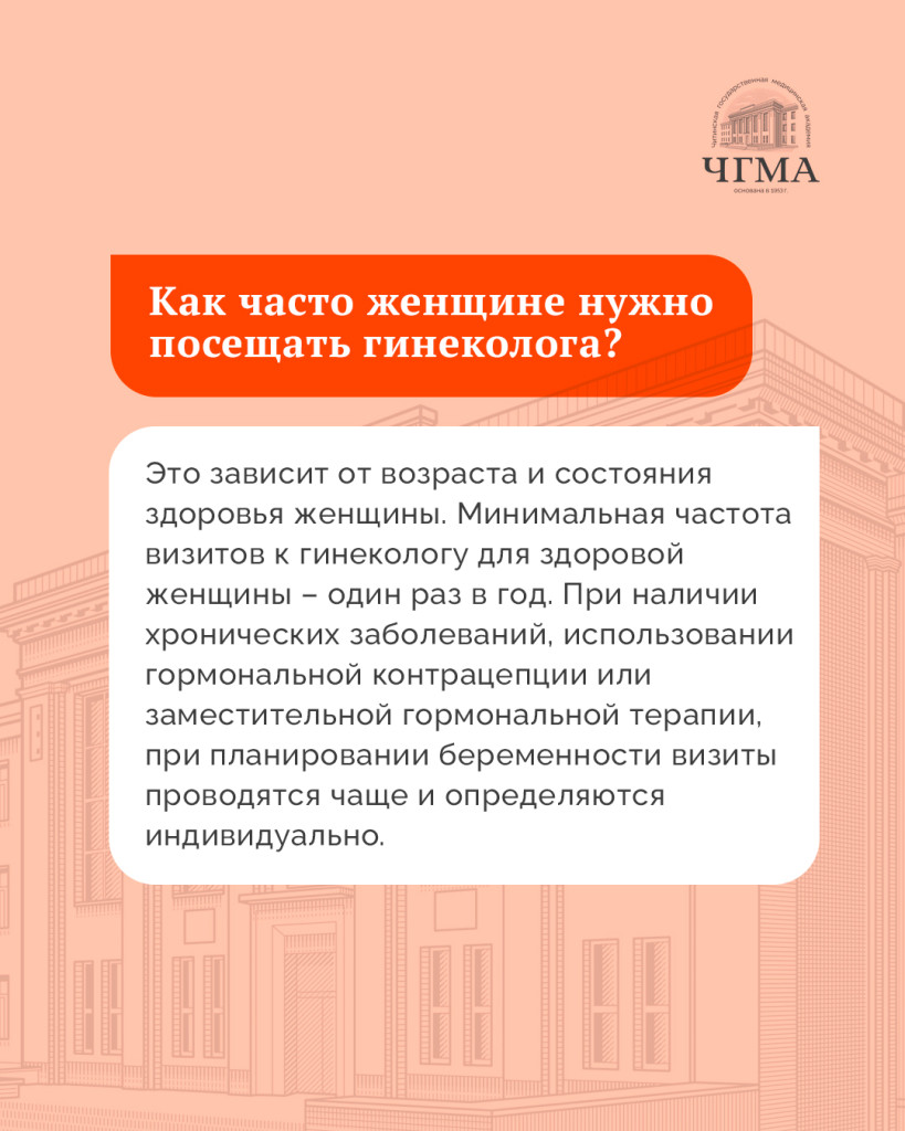 - Это зависит от возраста и состояния здоровья женщины. Минимальная частота визитов к гинекологу для здоровой женщины – один раз в год. При наличии хронических заболеваний, использовании гормональной контрацепции или заместительной гормональной терапии, при планировании беременности визиты проводятся чаще и определяются индивидуально.