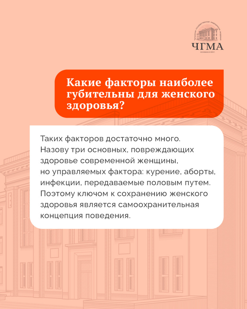 -Таких факторов достаточно много. Назову три основных повреждающих здоровье современной женщины, но управляемых фактора: курение, аборты, инфекции, передаваемые половым путем. Поэтому ключом к сохранению женского здоровья является самоохранительная концепция поведения.