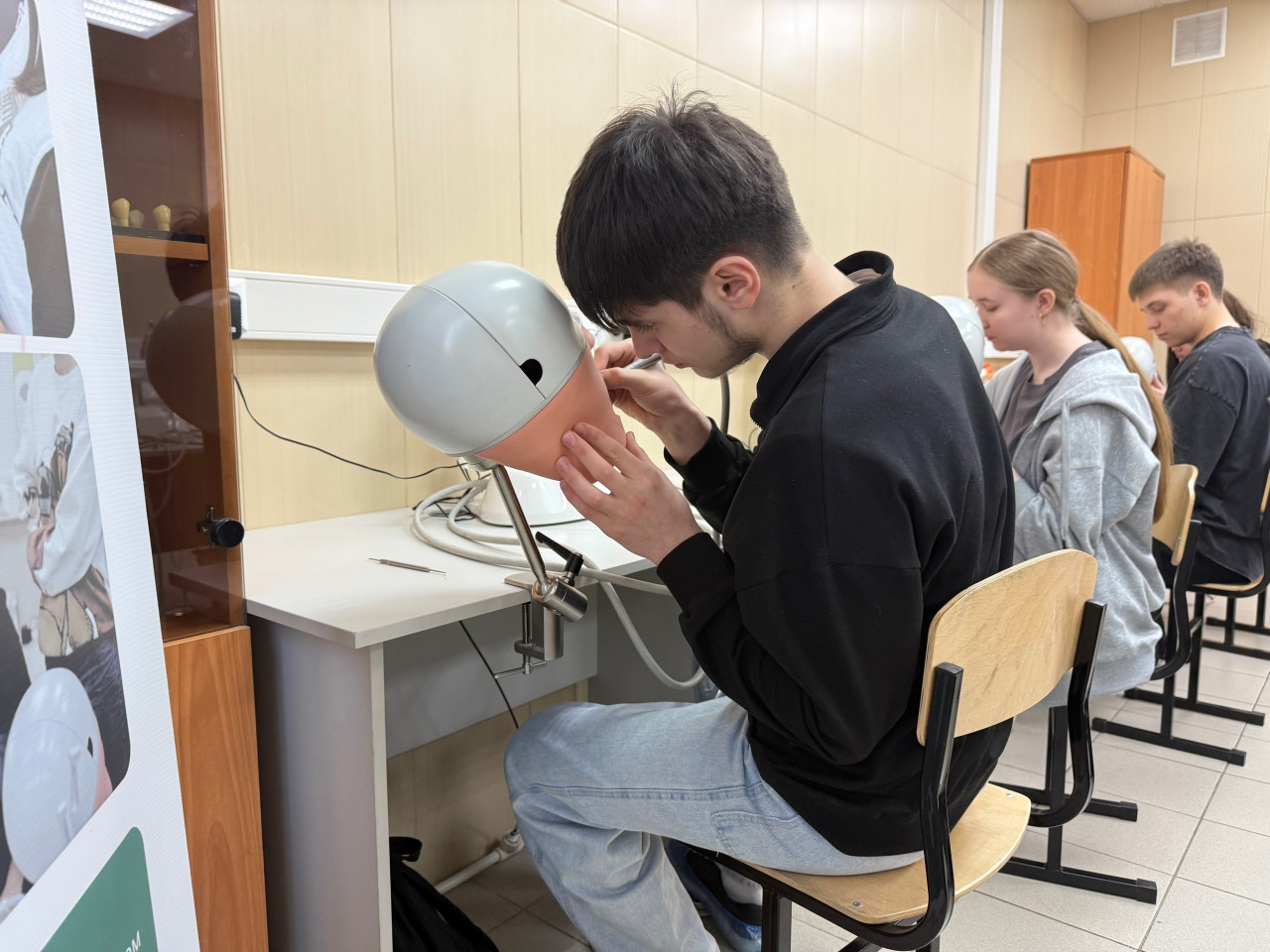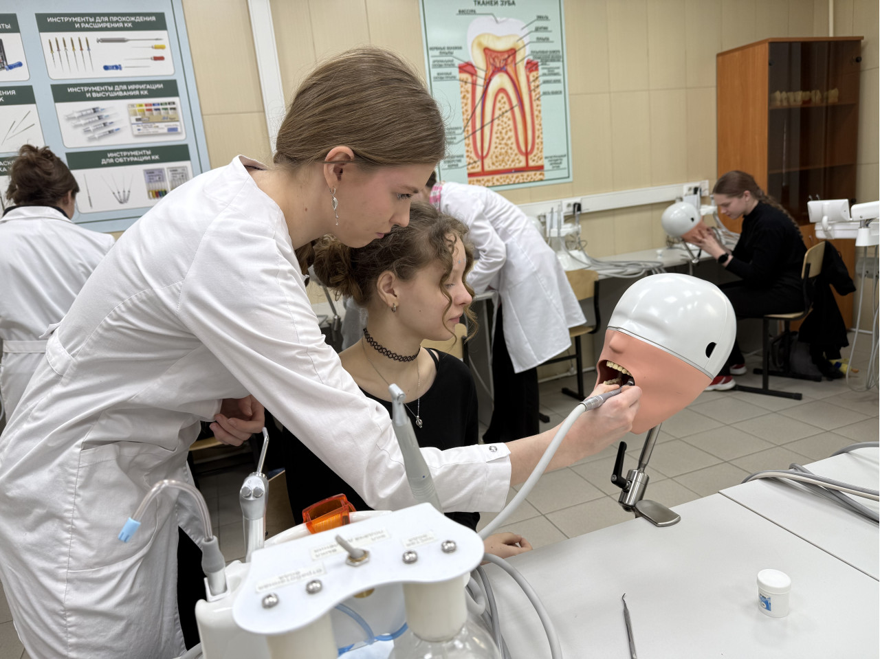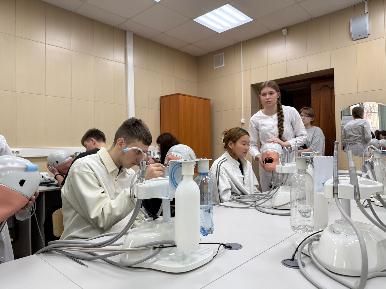 Будущие врачи-стоматологи из «Альянса молодых стоматологов» показали современное оборудование и учебные манекены, рассказали о тонкостях профессии и даже дали попробовать поработать с инструментами. Школьники учились препарировать зубы и устанавливать пломбировочный материал.