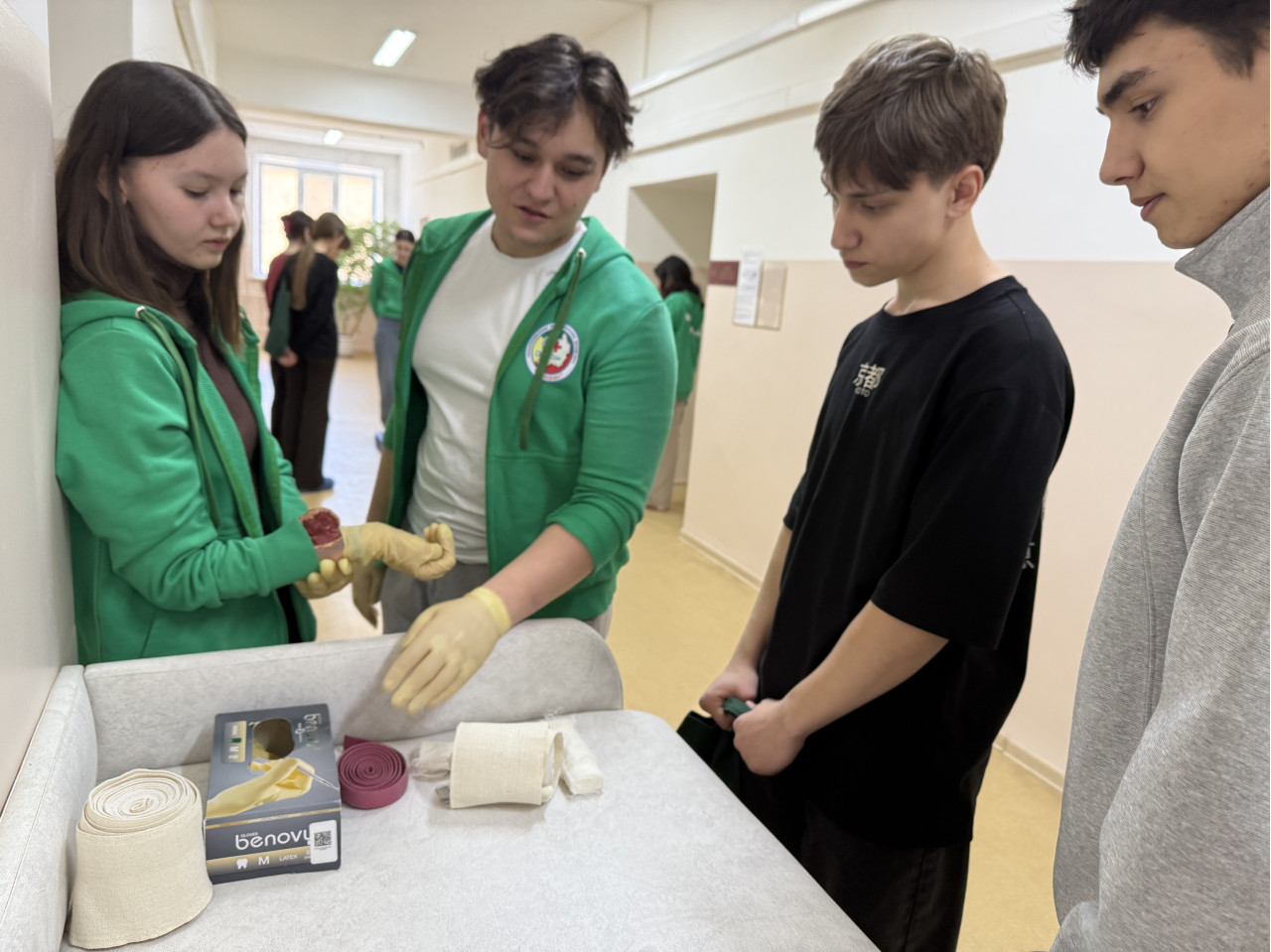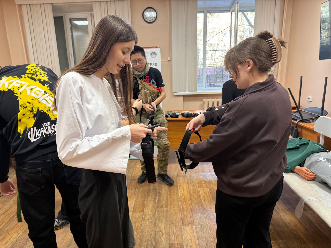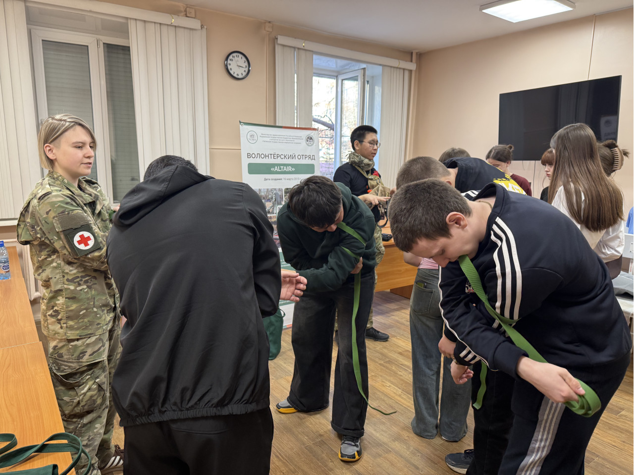 А участники отряда «ALTAIR» устроили для школьников знакомство с основами тактической медицины:рассказали, как оказывать помощь в экстремальных условиях, отработали навык наложения повязок в полевых условиях самому себе.