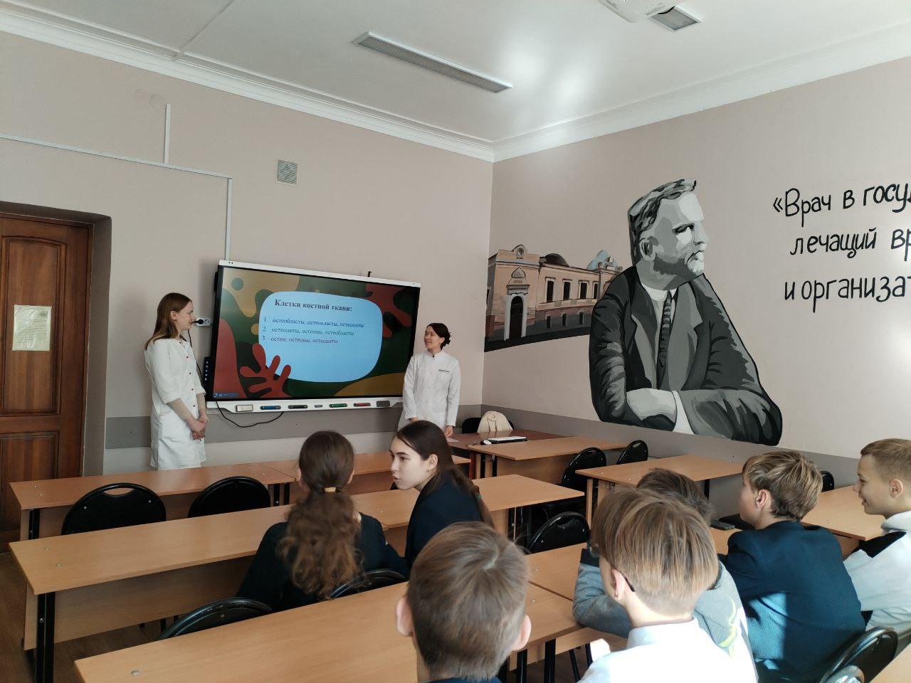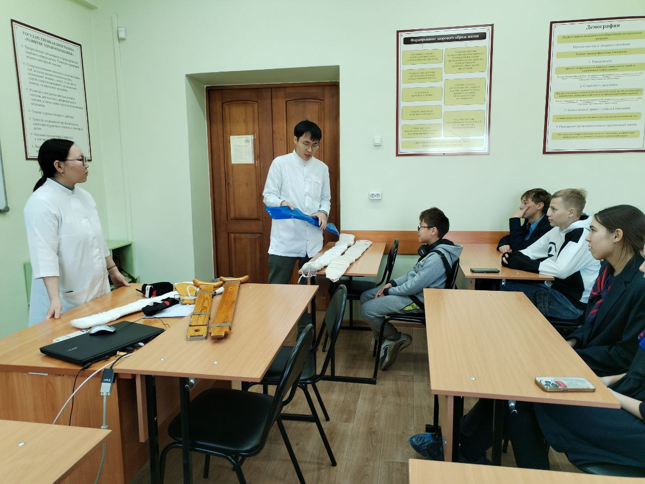Поговорили про травмы, основные причины травматизма, как его избежать и на что обратить внимание. Школьники отточили знания на практике - потренировались оказывать первую доврачебную медицинскую помощь при травмах опорно-двигательного аппарата. Они учились накладывать шины, фиксировать поврежденную конечность, останавливать кровотечение с помощью турникета. Завершился урок веселой игрой «Костная викторина».