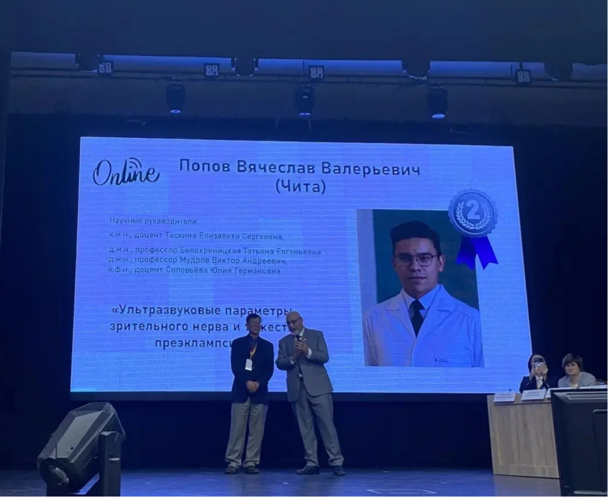 🎓 Студент и ассистент ЧГМА вошли в число победителей международной конференции на английском языке🥈🥉 22 апреля 2026 года на базе Кемеровского государственного медицинского университета состоялась XXX Международная научно-практическая конференция «Доказанное и сомнительное в акушерстве, гинекологии и неонатологии». В конкурсе докладов молодых учёных на английском языке почетное 2 место занял студент 648 группы педиатрического факультета Вячеслав Валерьевич Попов с докладом «Ультразвуковые параметры зрительного нерва и тяжесть преэклампсии / Optic nerve sheath ultrasound parameters and the severity of preeclampsia». Почетное 3 место занял ассистент кафедры акушерства и гинекологии педиатрического факультета и факультета дополнительного профессионального образования Дмитрий Владимирович Малько с докладом «Моделирование как метод снижения погрешности расчета предполагаемой массы плода/ Modeling as a method to reduce the error of estimated fetal weight calculation». В состав жюри вошли именитые профессора и эксперты из США🇺🇲, ОАЭ🇦🇪, Китая🇨🇳, Ливана🇱🇧 и России🇷🇺. Научные руководители В.В. Попова: доцент кафедры офтальмологии, к.м.н., доцент Е.С. Таскина; заведующая кафедрой акушерства и гинекологии педиатрического факультета и факультета дополнительного профессионального образования, д.м.н., профессор Т.Е. Белокриницкая; профессор кафедры акушерства и гинекологии педиатрического факультета и факультета дополнительного профессионального образования, д.м.н., доцент В.А. Мудров; заведующая кафедрой иностранных языков, к.ф.н., доцент Ю.Г. Соловьева. Научные руководители Д.В. Малько: заведующая кафедрой акушерства и гинекологии педиатрического факультета и факультета дополнительного профессионального образования, д.м.н., профессор Т.Е. Белокриницкая; профессор кафедры акушерства и гинекологии педиатрического факультета и факультета дополнительного профессионального образования, д.м.н., доцент В.А. Мудров. Поздравляем Вячеслава Валерьевича и Дмитрия Владимировича и его наставников с достойным результатом и желаем дальнейших профессиональных успехов.