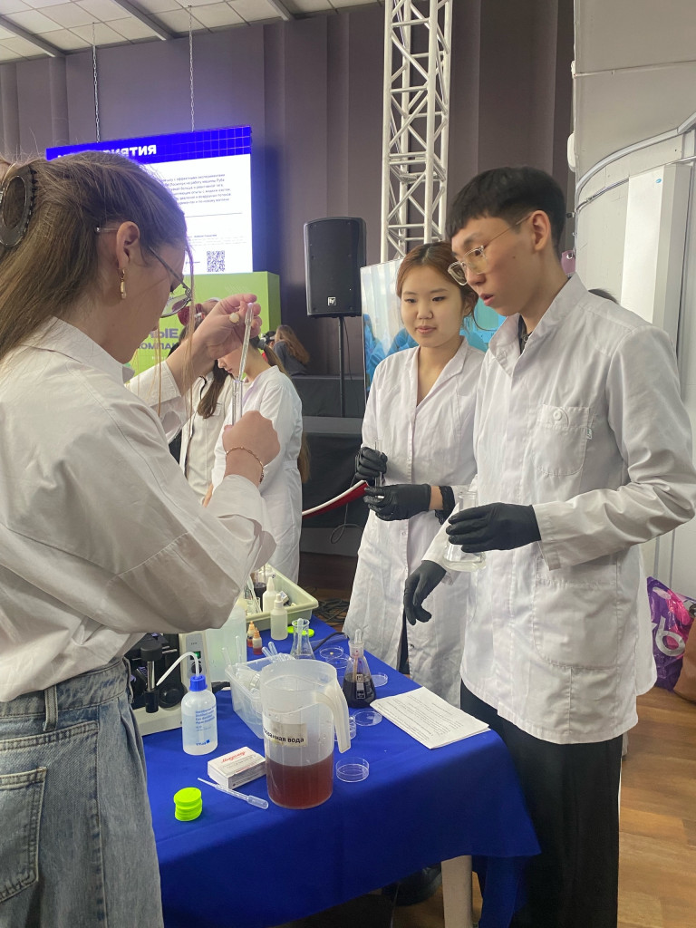 Вторая площадка, получившая название «Занимательная химия», превратилась в настоящую научную лабораторию. Студенты Лхамажаб Дашибалова, Булат Бурунов, Степан Дробышев и Туяна Дугаржапова подготовили около десяти ярких и безопасных химических опытов. Самое ценное – каждый посетитель фестиваля мог не просто посмотреть на превращения веществ, но и провести эксперимент самостоятельно. «Реакция зала превзошла все ожидания: дети в восторге, а их родители с интересом слушают объяснения химических процессов», – поделились впечатлениями организаторы площадки.