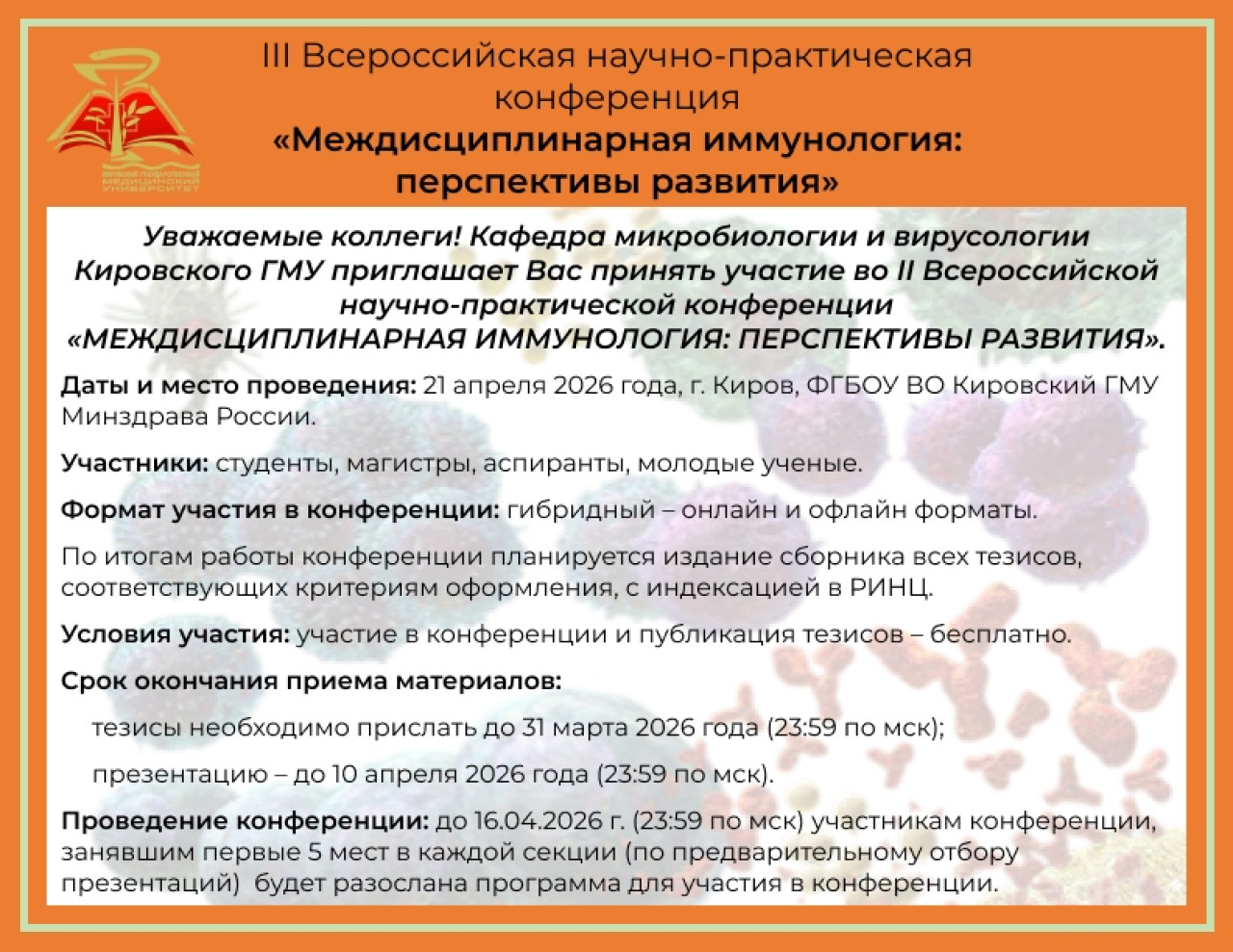 Научное общество молодых ученых и студентов и кафедры микробиологии и вирусологии Кировского ГМУ приглашает на III Всероссийскую научно-практическую конференцию «Междисциплинарная иммунология: перспективы развития», которая состоится 21 апреля 2026 г.