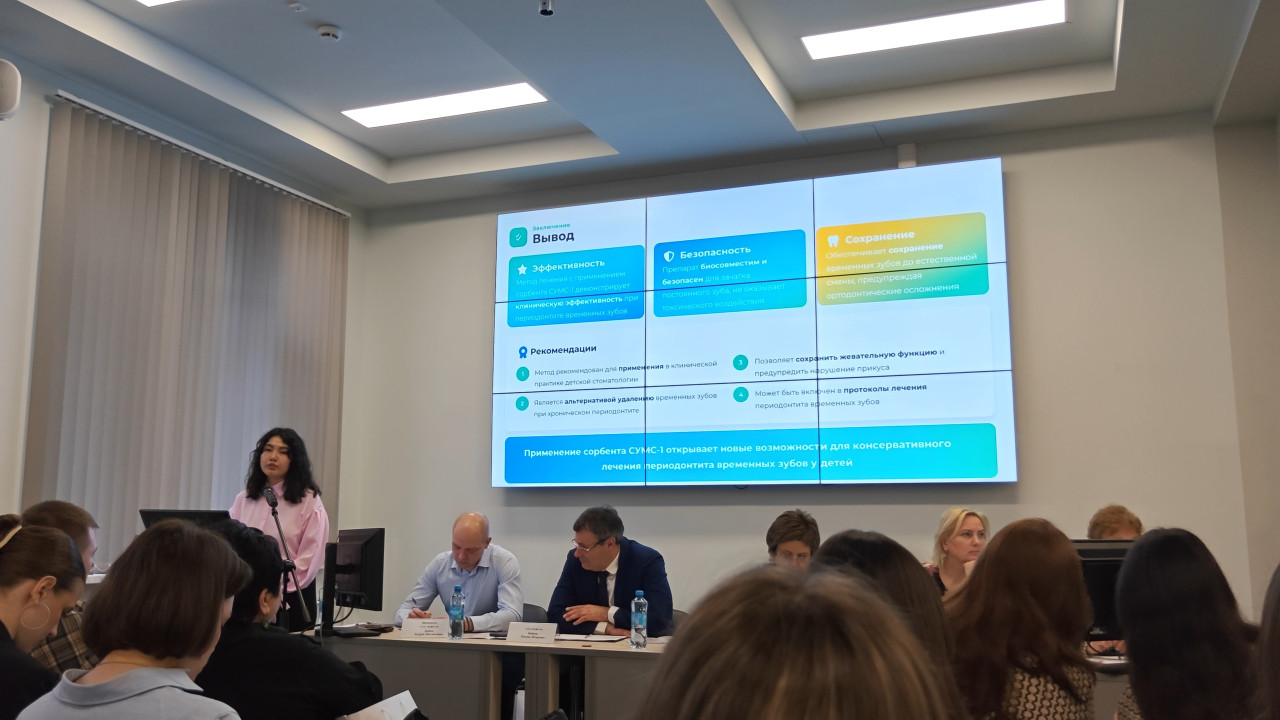 Нашу академию в секции ординаторов достойно представила Алтана Алдаровна Дашибалбарова — ординатор второго года обучения по специальности «Стоматология детская». Она выступила с докладом «Лечение хронического периодонтита временных зубов с использованием сорбента», подготовленным под руководством к.м.н., доцента Александры Моисеевны Петровой и д.м.н., профессора Иосифа Семёновича Пинелиса.