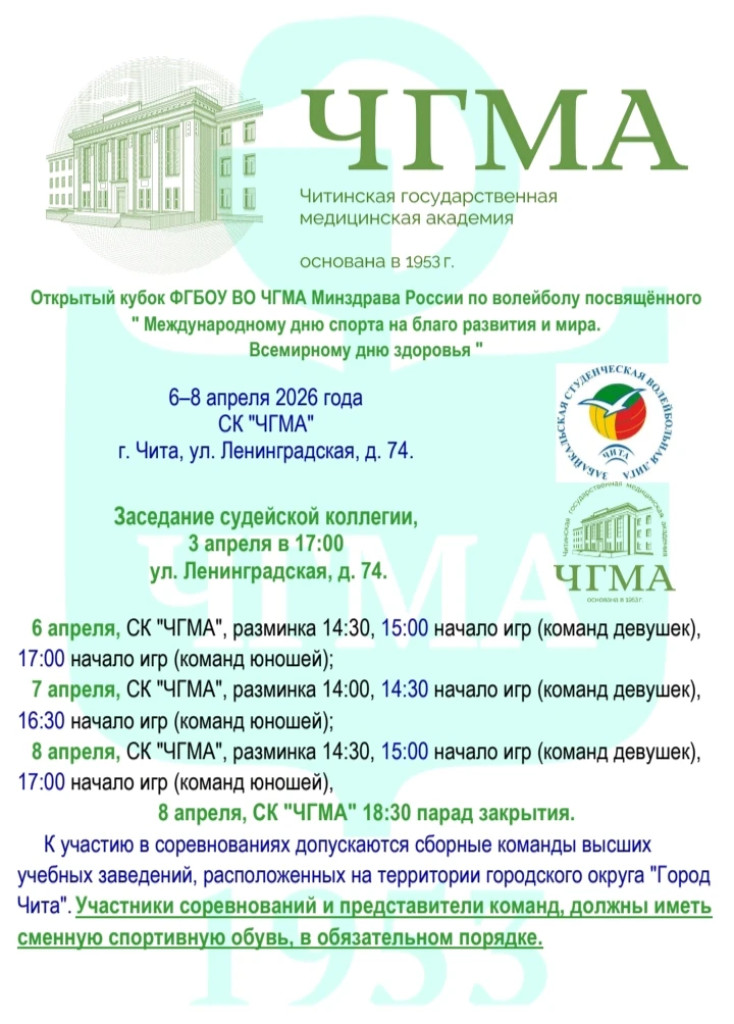6-8 апреля состоится Открытый кубок ФГБОУ ВО "ЧГМА" Минздрава России по волейболу.