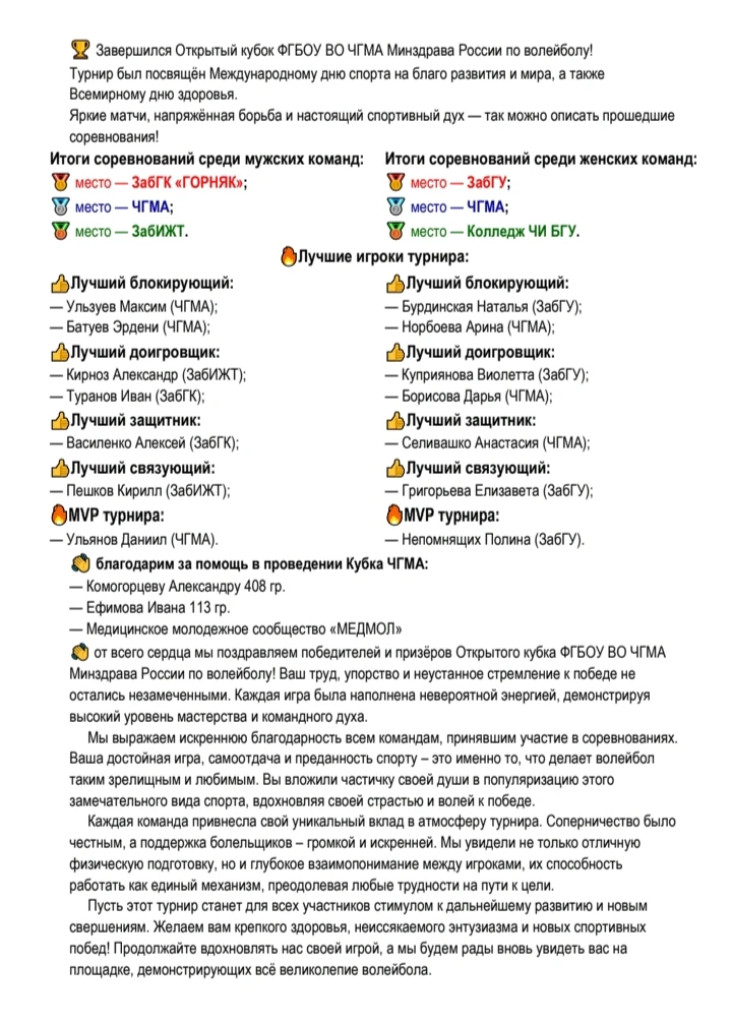 АбитуриентуЗавершился Открытый кубок ФГБОУ ВО "ЧГМА" Минздрава России по волейболу.