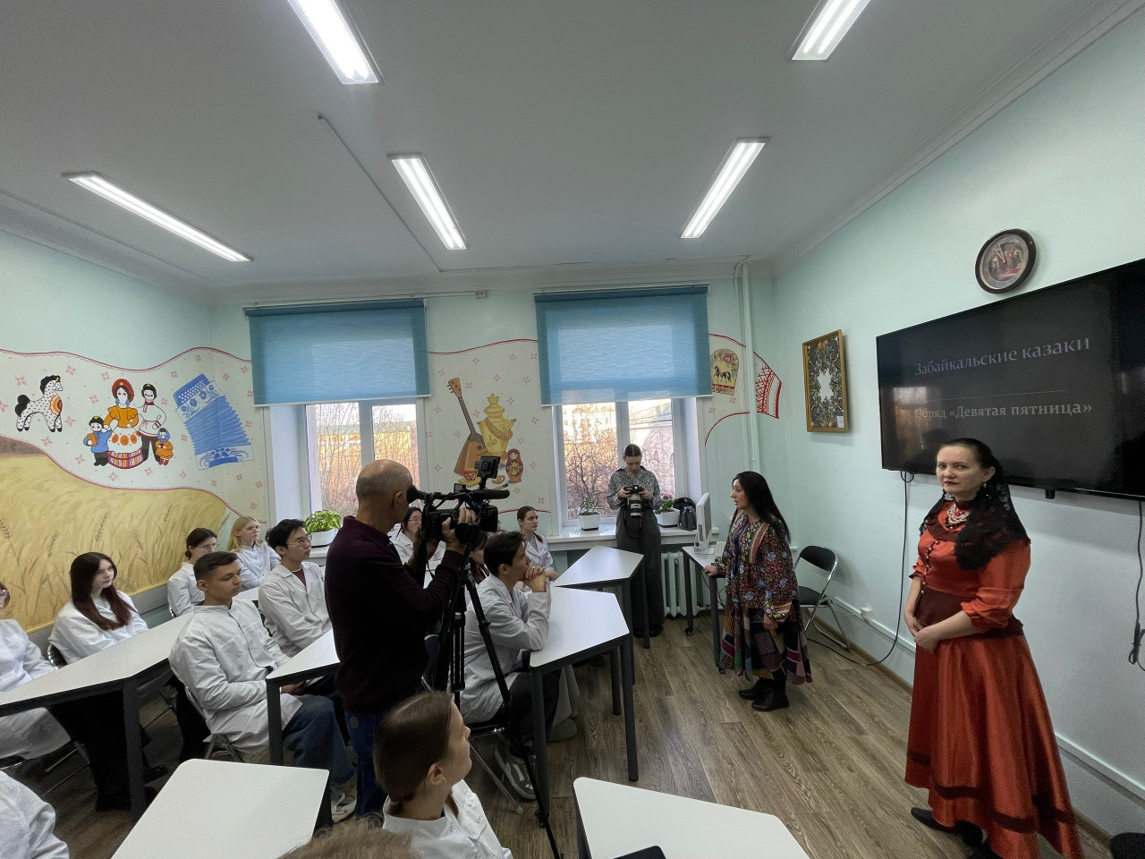 Филатова Алёна Валерьевна, заведующая отделом традиционной культуры, ответила на все вопросы: интересно, с удивительными примерами из жизни забайкальских казаков, на экране уникальные фотографии, звучат казачьи песни. Студенты погрузились в атмосферу жизни и быта казаков. А вот перед нами казачка, все элементы костюма имеют важный смысл, все теперь расшифрованы для студенческой аудитории