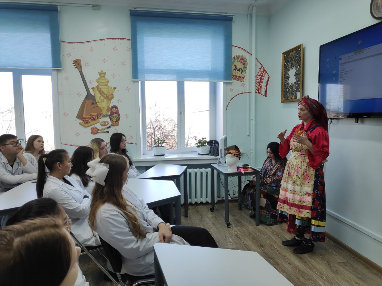 Рязанцева Татьяна Сергеевна, методист отдела традиционной культуры, в костюме семейских. Она не просто рассказывает о быте, вере, занятиях семейских, она показывает детали одежды, она поет с коллегой песню, она показывает, как создавали, например, бусы.