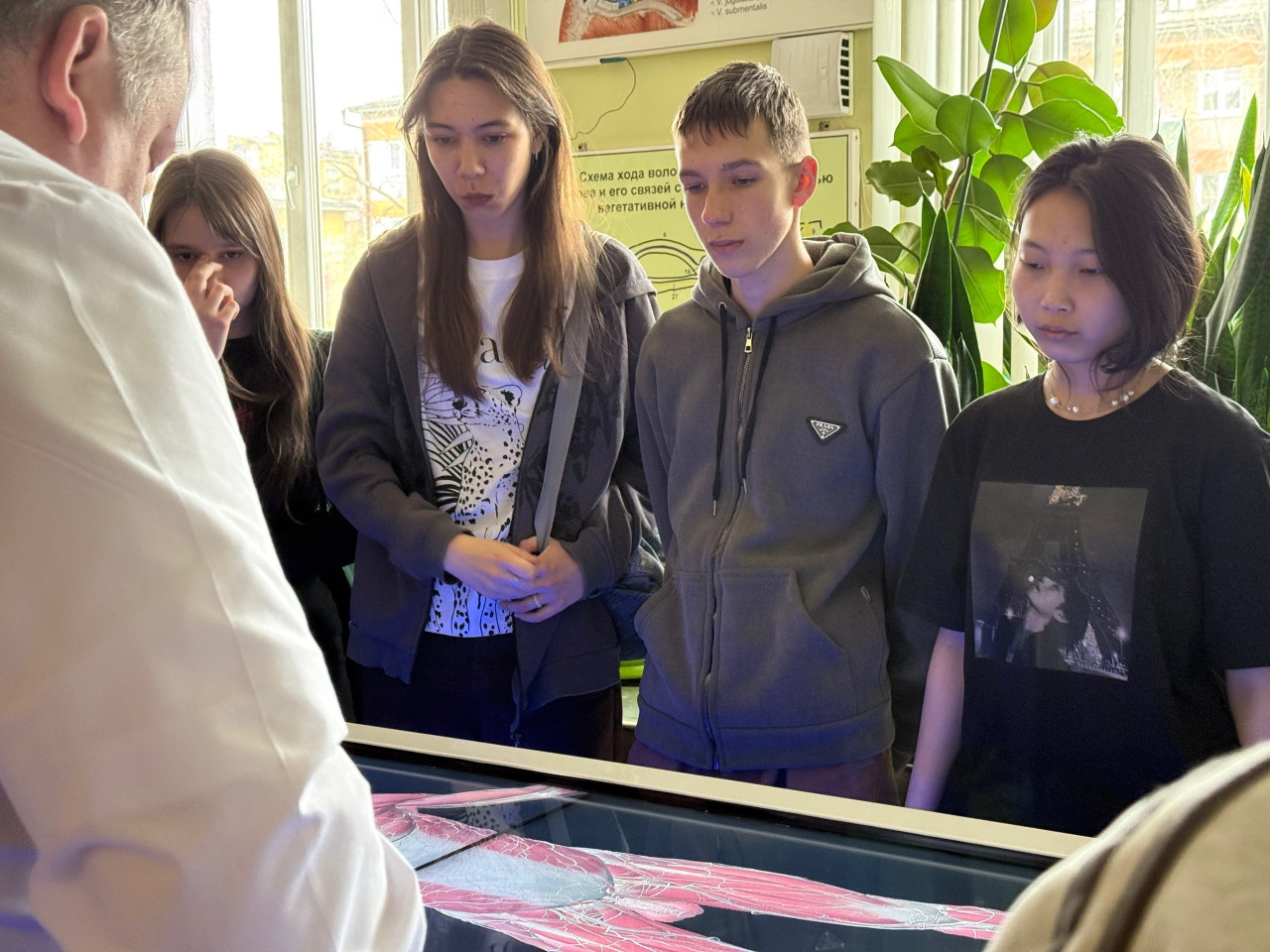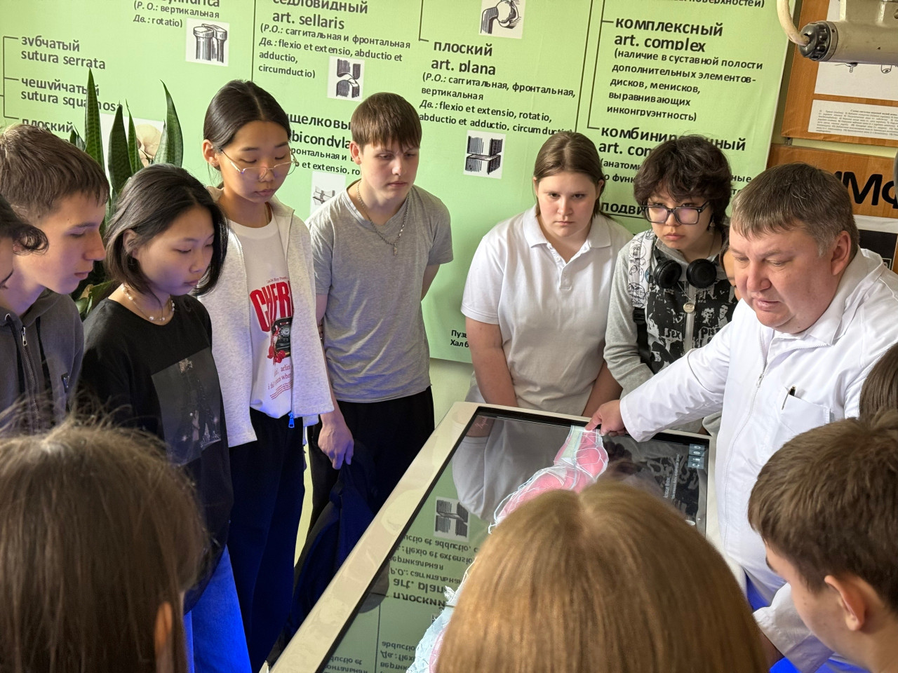 Современный компьютерный анатомический стол и его возможности школьникам продемонстрировал заведующий кафедрой анатомии с курсом топографической анатомии и оперативной хирургии, кандидат медицинских наук, доцент Антон Викторович Любин. Это вызвало настоящий восторг! С помощью инновационной 3D‑технологии можно «разбирать» модель человека по слоям, рассматривать органы под разными углами, изучать взаимосвязи между системами организма в интерактивном режиме.