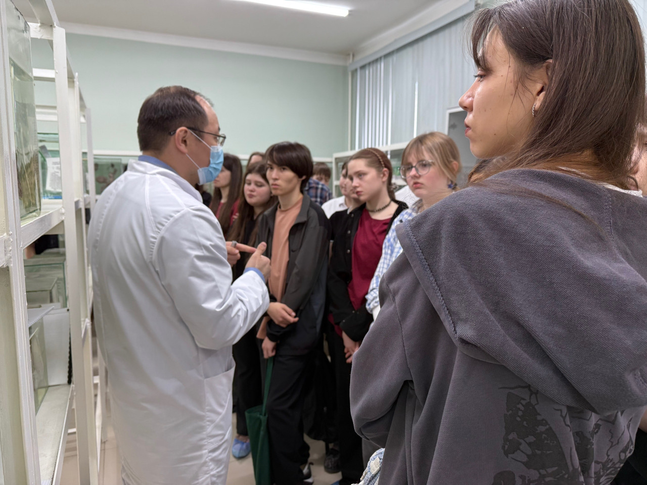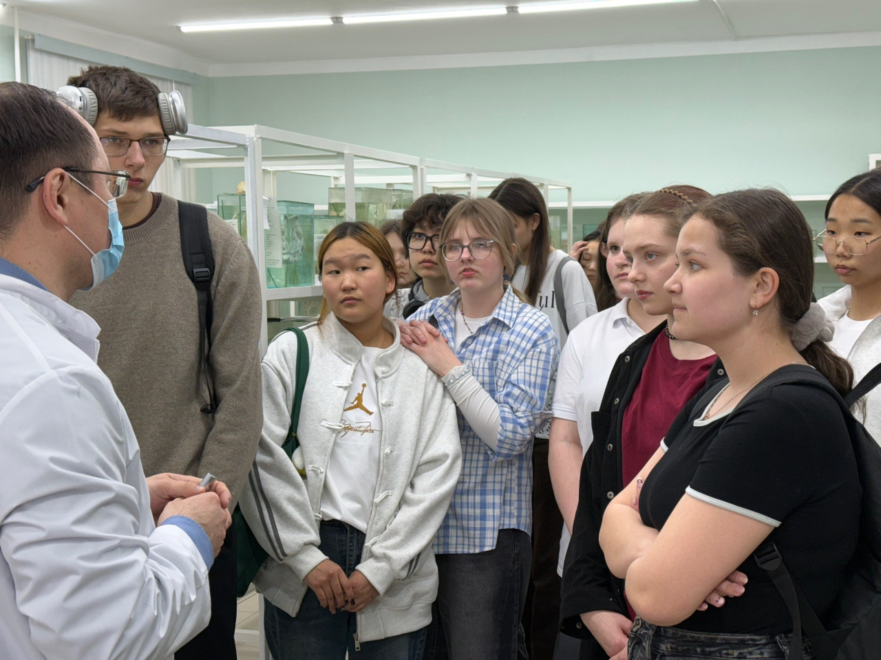 После теоретических занятий школьников ждало настоящее погружение в мир анатомии. Знакомство с удивительным миром человеческого организма началось с музея нормальной анатомии. Здесь участники увидели уникальные анатомические препараты и узнали, как устроено здоровое человеческое тело. Старший преподаватель кафедры анатомии с курсом топографической анатомии и оперативной хирургии Руслан Иванович Дамдинов подробно рассказал о строении органов и систем, каким образом изготавливаются анатомические препараты — многие открытия стали настоящим сюрпризом для ребят!