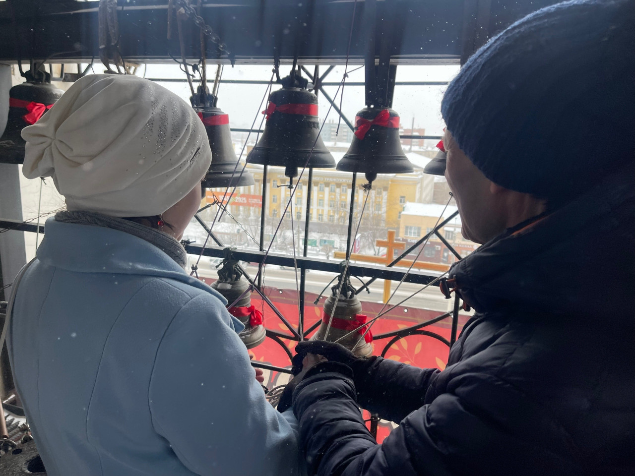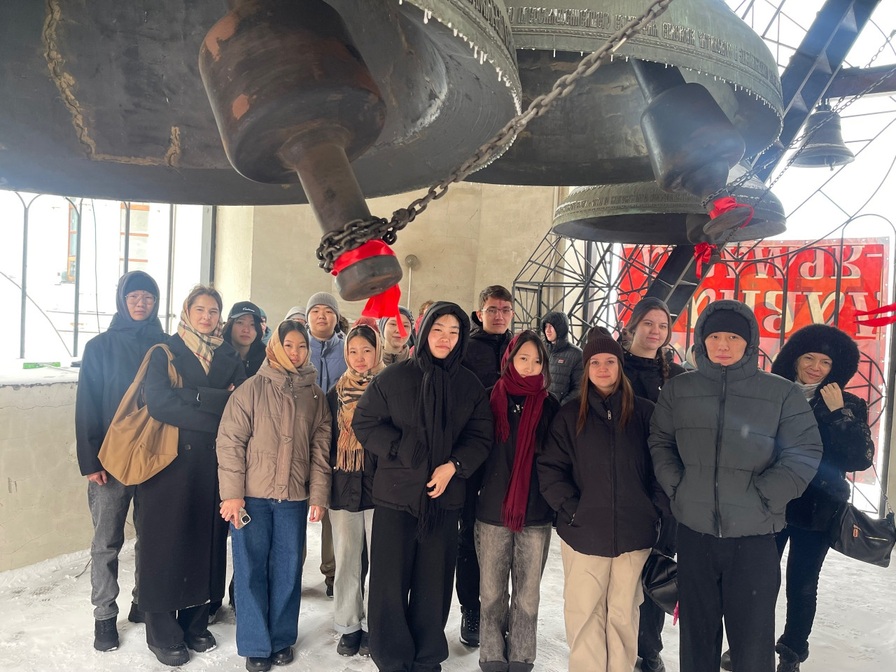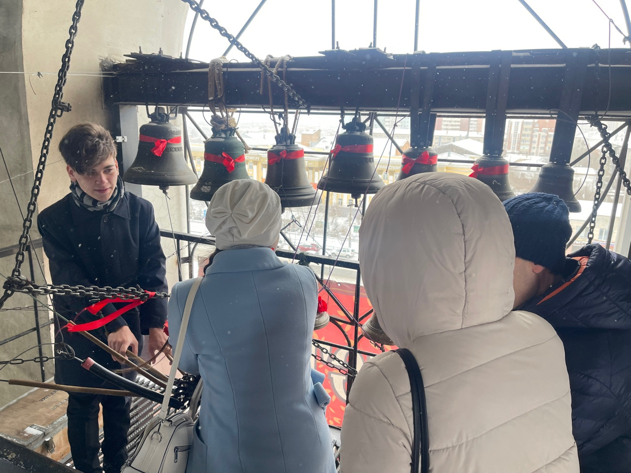 В цокольном этаже собора экскурсантов встретил Александр Аникин, руководитель передвижной звонницы Читинской епархии. Перед студентами звонница. Разные колокола, разный звук, разные звоны. Александр Юрьевич рассказал об истории колокольного звона, отношении русских к колоколу, а потом колокола зазвучали. Благовест, перезвон, трезвон, перебор: когда используют звоны и почему. Колокольный звон встречал человека при рождении и провожал его в последний путь. Студенты с удовольствием попробовали позвонить в колокола на передвижной звоннице, а потом уже поднялись на колокольню. Холодный ветер и снег не стали преградой, над Читой радостный колокольный звон, созданный студентами академии.