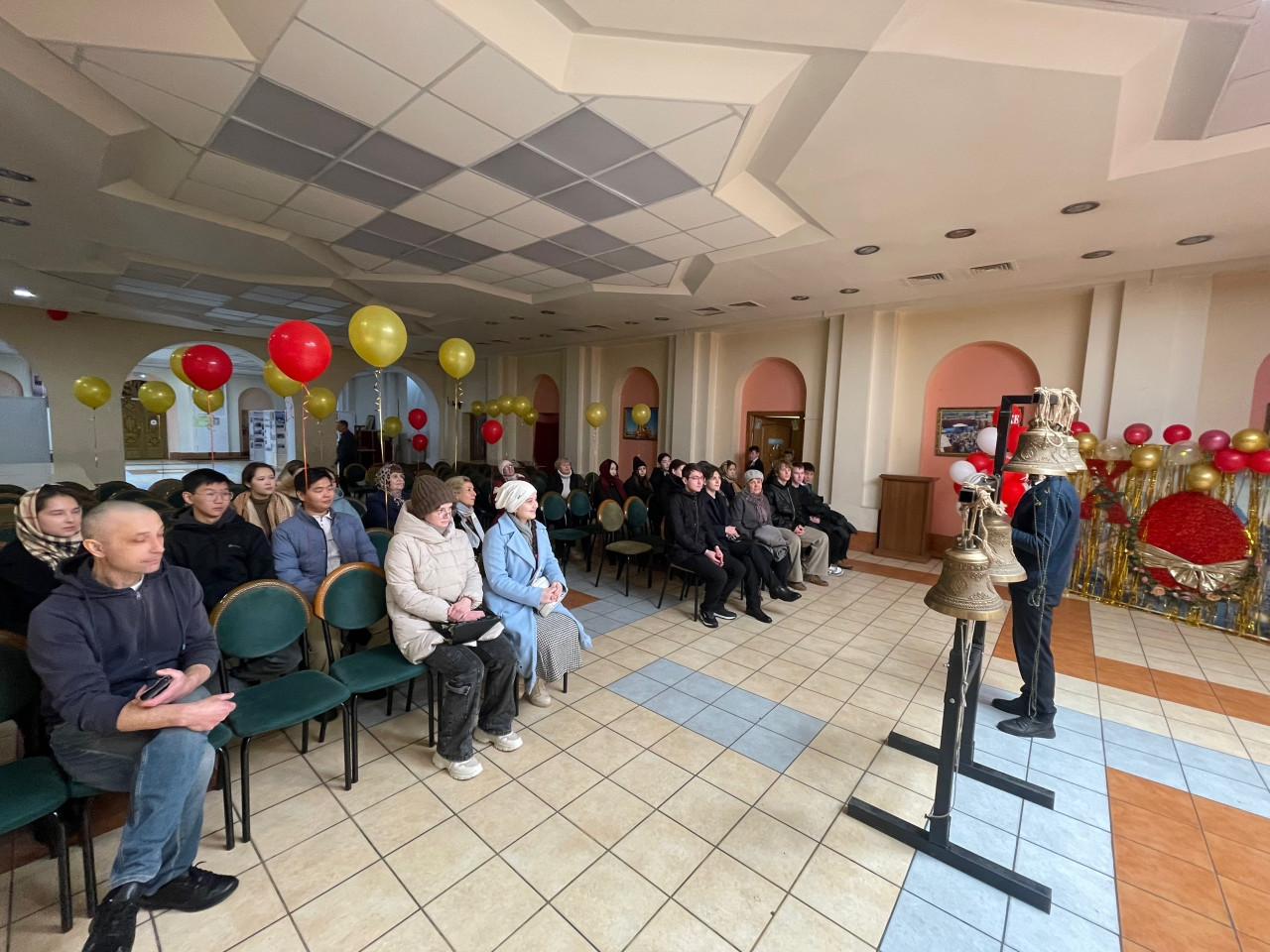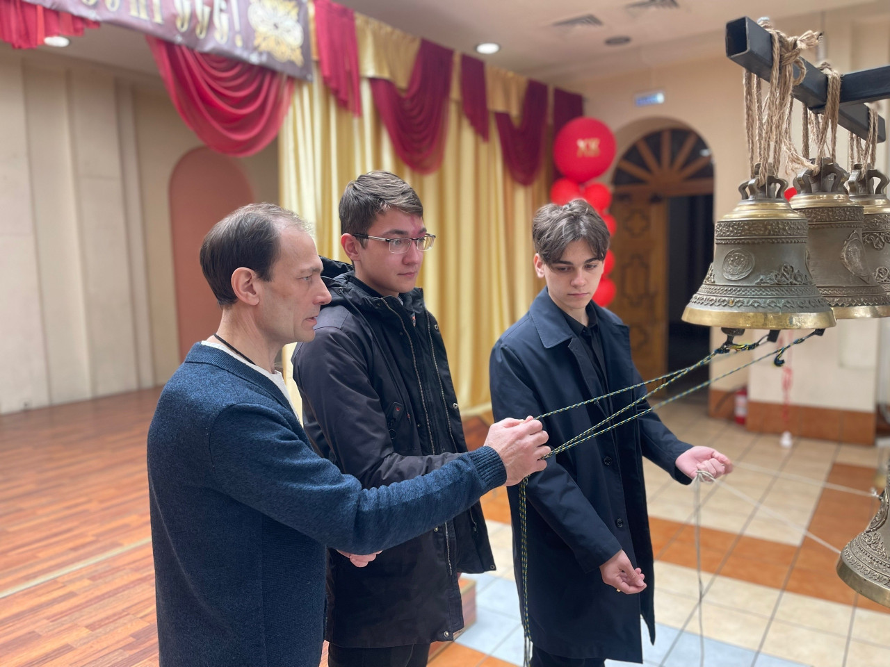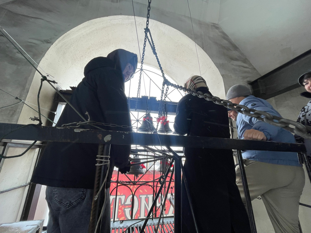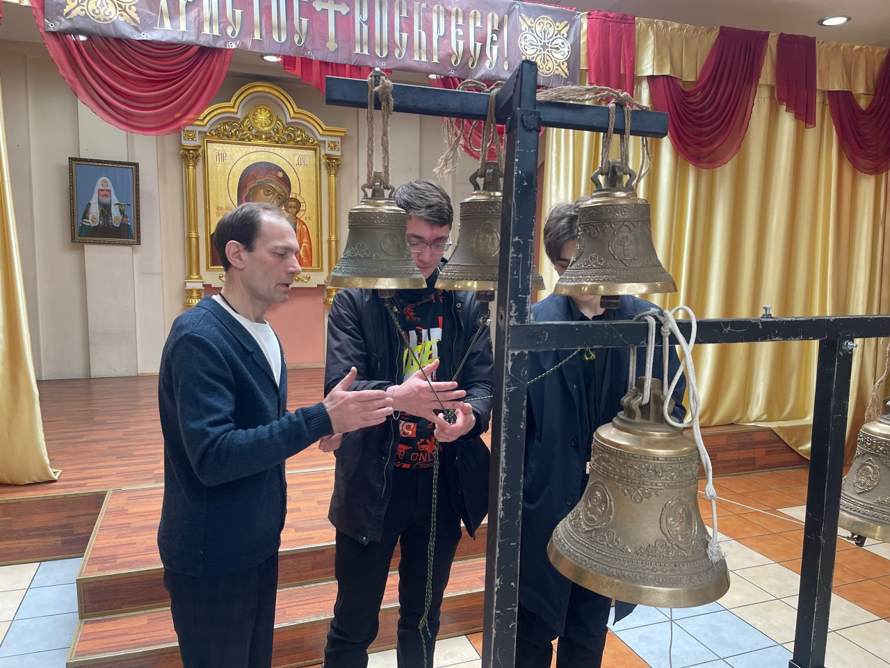 В цокольном этаже собора экскурсантов встретил Александр Аникин, руководитель передвижной звонницы Читинской епархии. Перед студентами звонница. Разные колокола, разный звук, разные звоны. Александр Юрьевич рассказал об истории колокольного звона, отношении русских к колоколу, а потом колокола зазвучали. Благовест, перезвон, трезвон, перебор: когда используют звоны и почему. Колокольный звон встречал человека при рождении и провожал его в последний путь. Студенты с удовольствием попробовали позвонить в колокола на передвижной звоннице, а потом уже поднялись на колокольню. Холодный ветер и снег не стали преградой, над Читой радостный колокольный звон, созданный студентами академии.