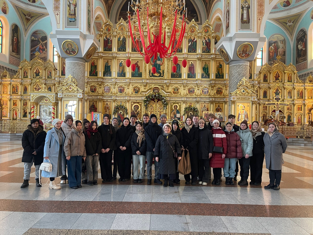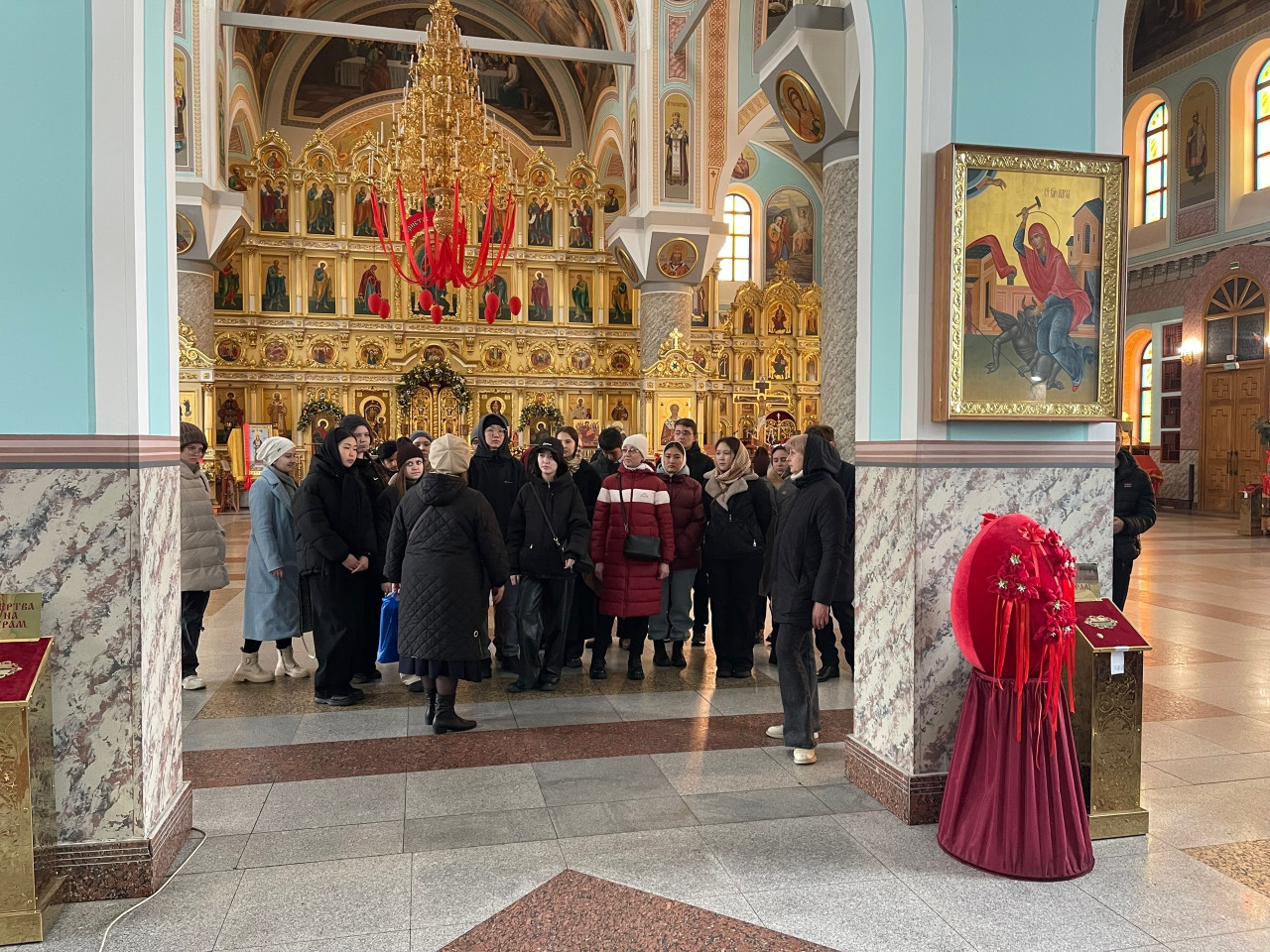Во время экскурсии внимание студентов было обращено и на другие сюжеты Евангельских событий в росписи собора, иконографию, образы некоторых святых, особенно защитников Отечества.