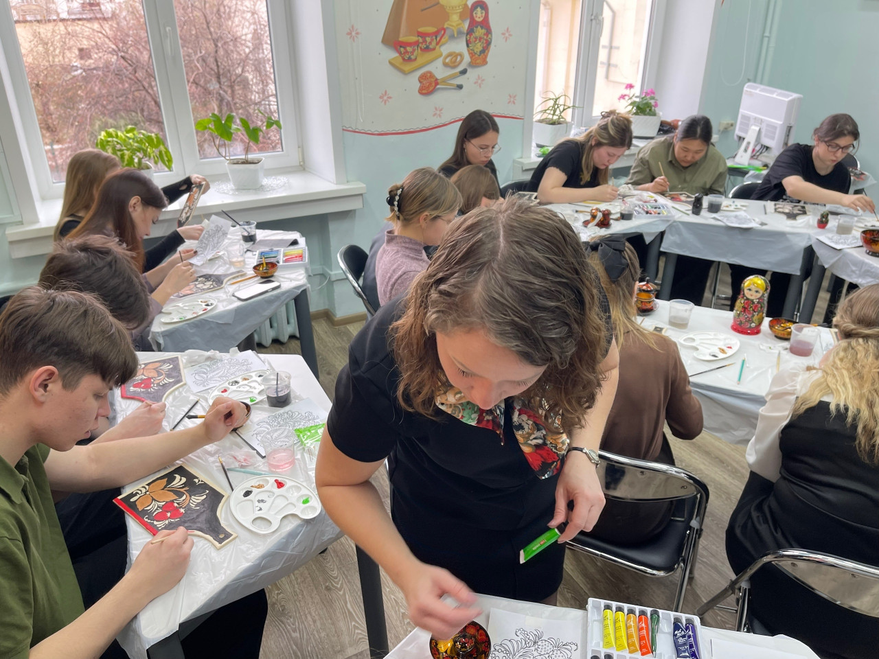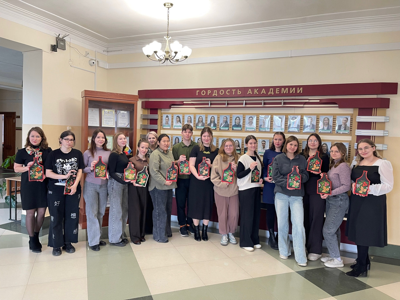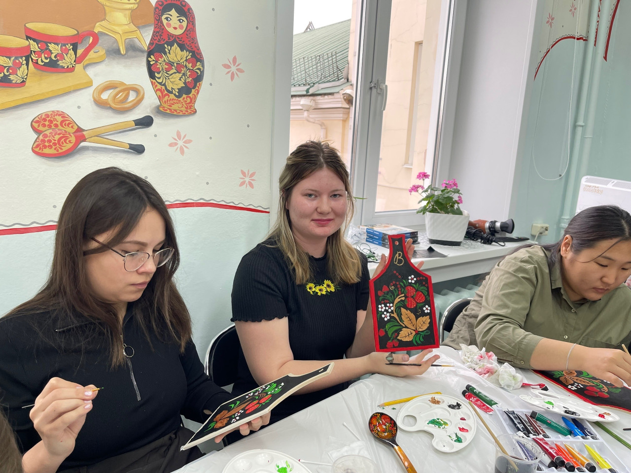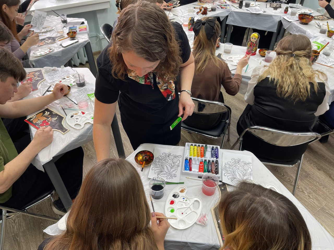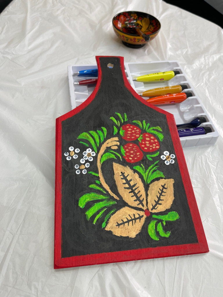 Студенты академии, участники мастер-класса, смогли почувствовать себя мастерами хохломского промысла. В их руках была деревянная доска, на которой нужно было создать основу черного цвета, а затем рисунок – ягоды и цветы. И вот на черном фоне заиграли яркие мазки. «Мне очень понравился мастер-класс, представила себя на Нижегородской земле мастером, художником. Это мой самый любимый русский узор», – отметила студентка 3 курса Алина Калугина.