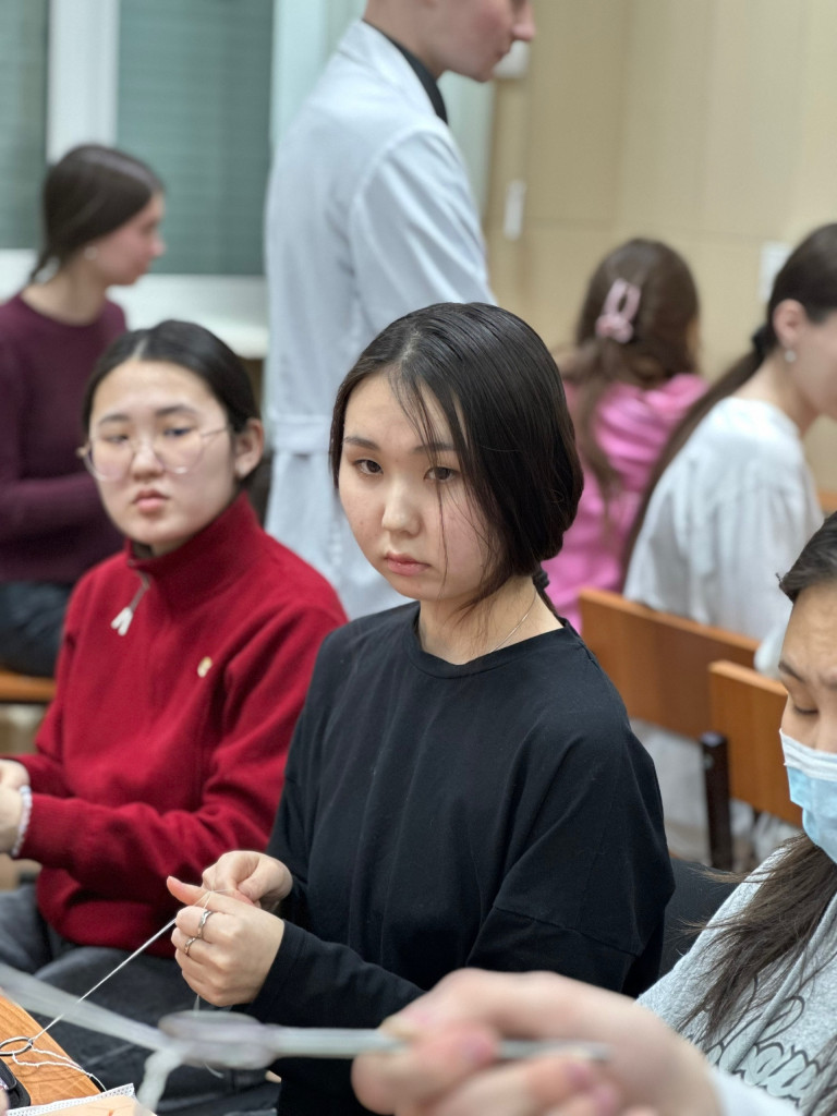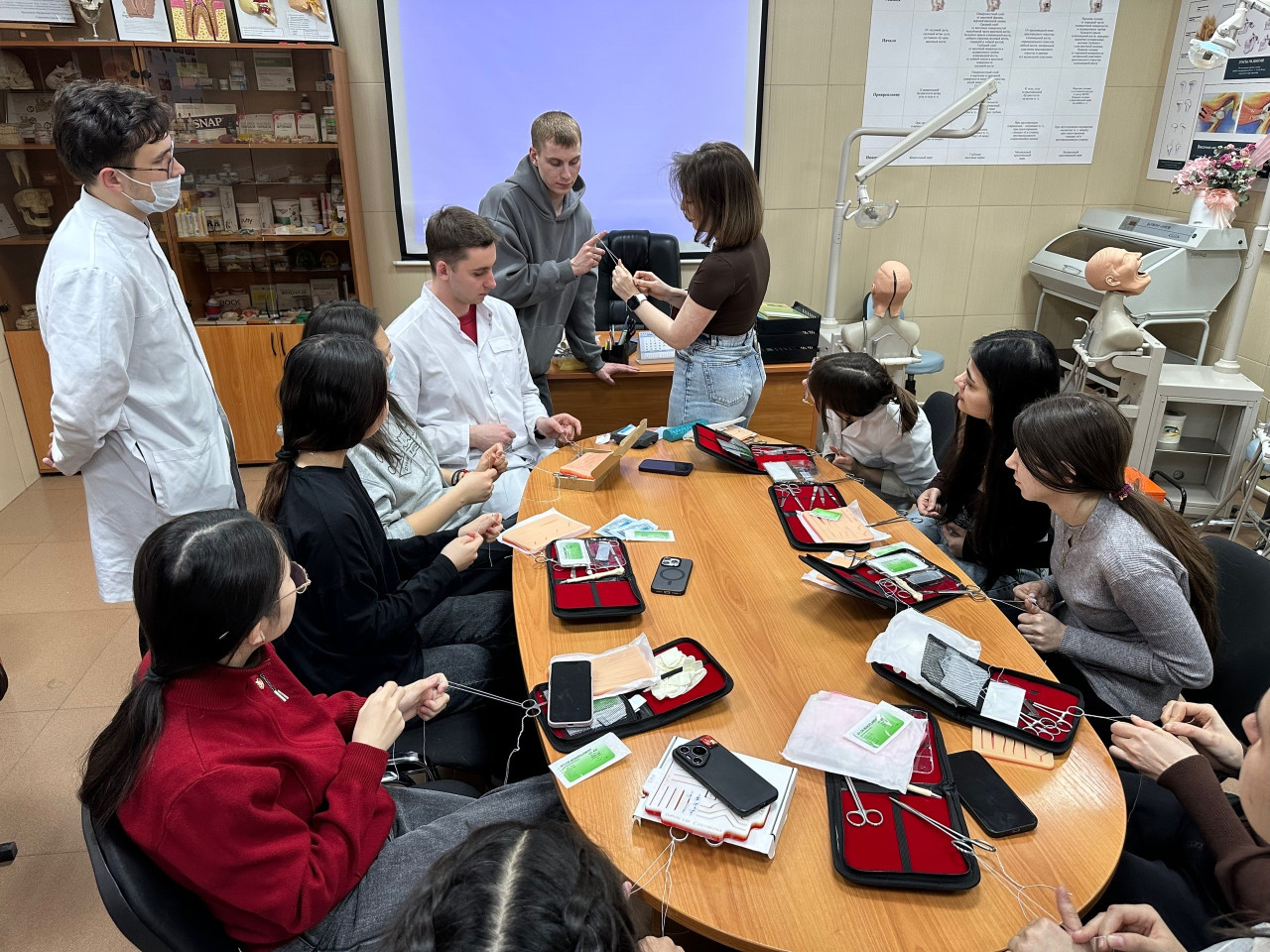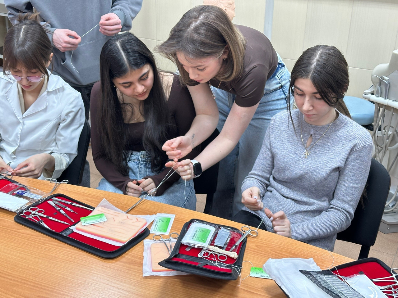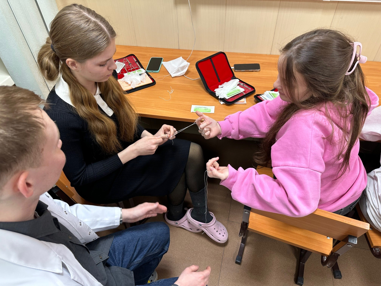 В ходе увлекательного мастер-класса под внимательным руководством опытных наставников ребята тренировались в наложении различных видов хирургических швов и знакомились с правилами правильного вязания хирургических узлов. Полученные навыки позволят укрепить базовые знания и подготовить молодых специалистов к предстоящей самостоятельной практике.